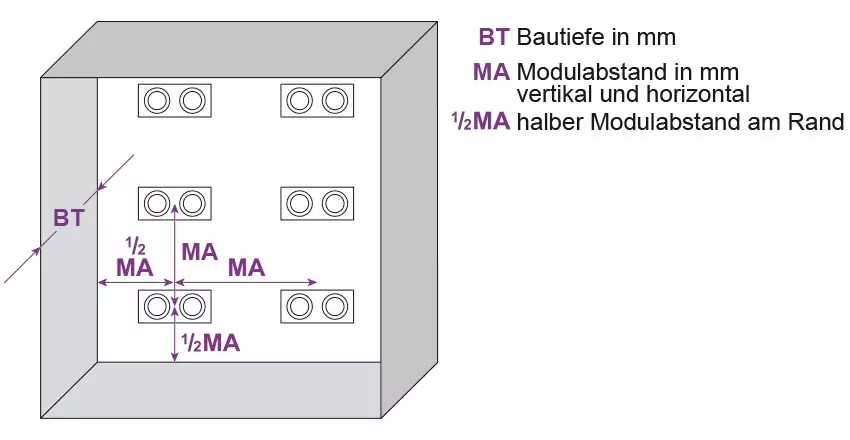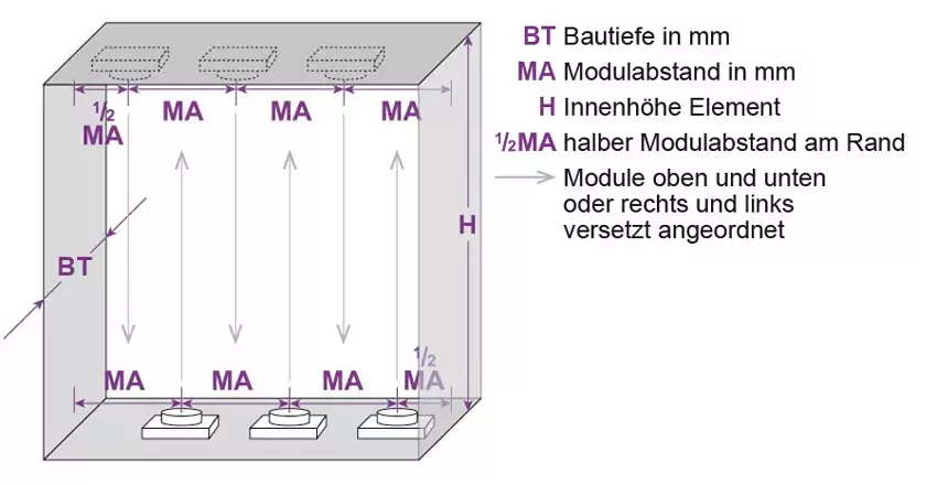 Alle Maße sind in mm, der Abstand bezieht sich immer auf die Mitte des Moduls.